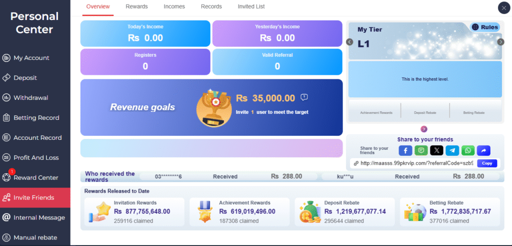 - Finally, you enter the dashboard of the Pkrvip platform.