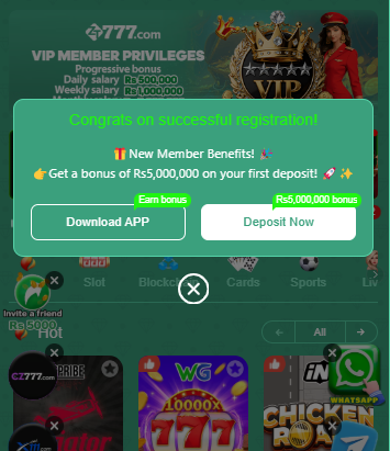 - Welcome Bonuses: Upon successful registration, users are greeted with a highly visible claim for a bonus of Rs 5,000,000 on their first deposit.