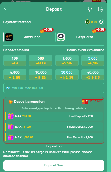 Financial Ease: The use of JazzCash for my first deposit was seamless, taking less than two minutes. Seeing the bonus automatically calculated and added was reassuring, though the large Rs 5,000,000 claim likely comes with stringent wagering conditions that require detailed reading. The minimum deposit of Rs 100 makes it very accessible.